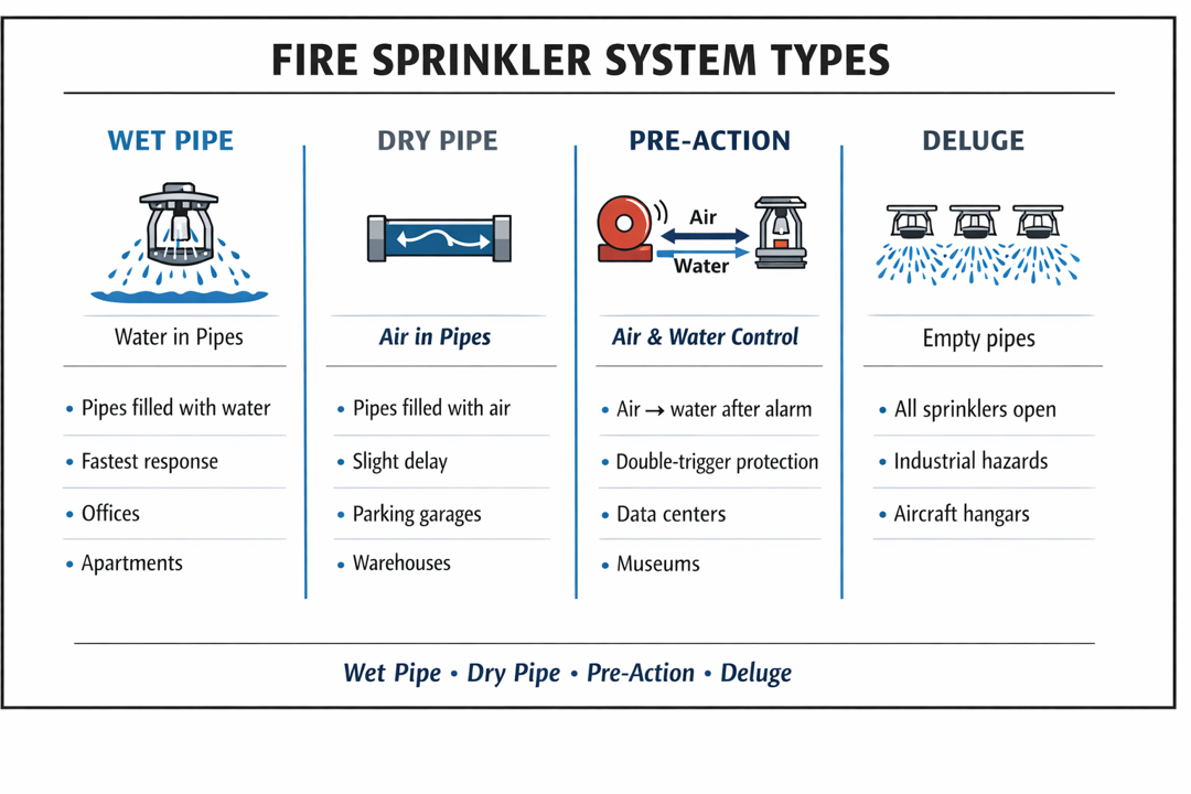 Understanding the differences between wet pipe, dry pipe, pre-action, and deluge fire sprinkler systems is essential for selecting the right fire protection strategy for any building.